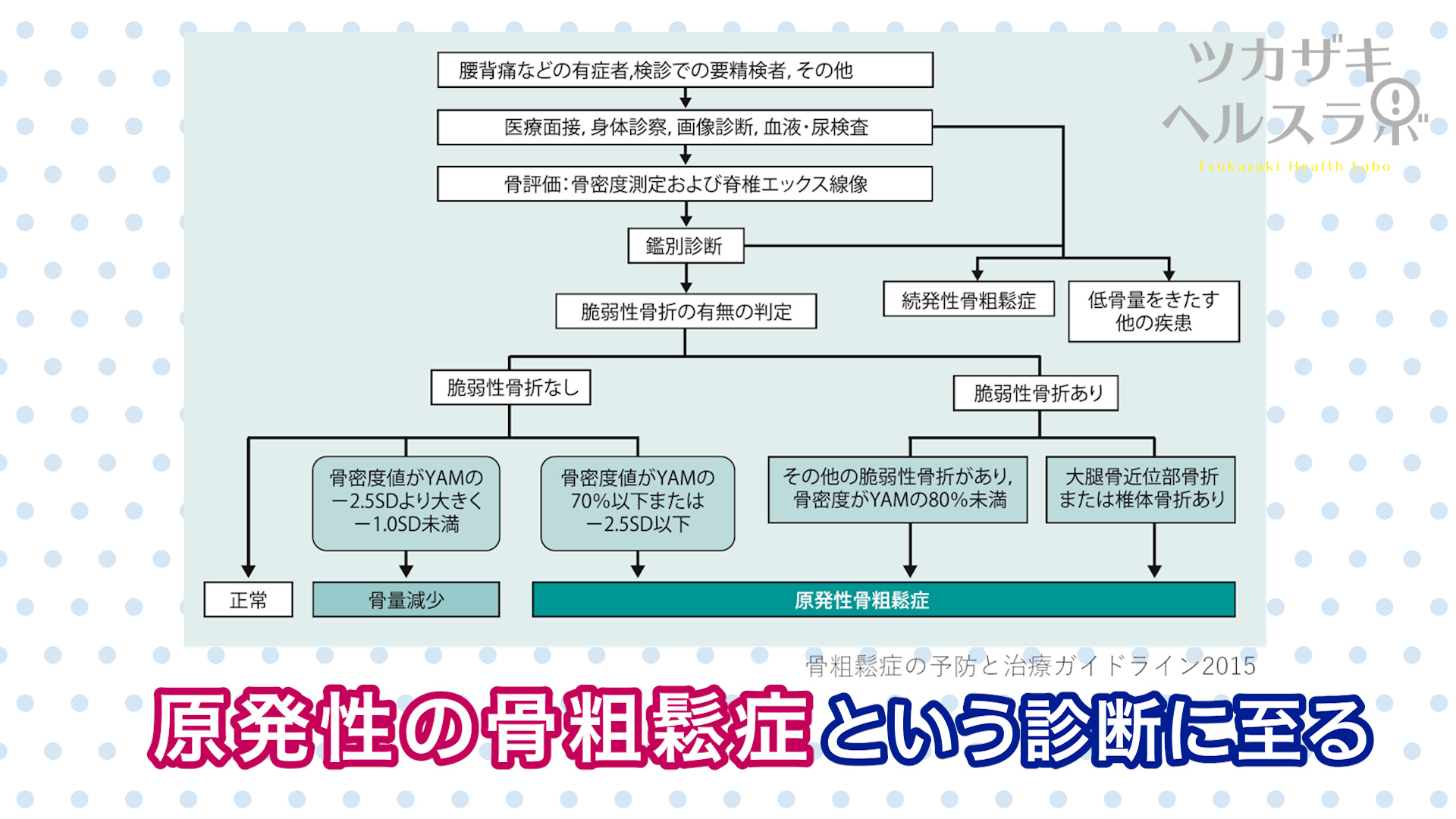 細かいところを除くと基本的には骨が1か所、どこか骨の脆弱性の骨折が起こってしまうと原発性の骨粗鬆症という診断に至ります。