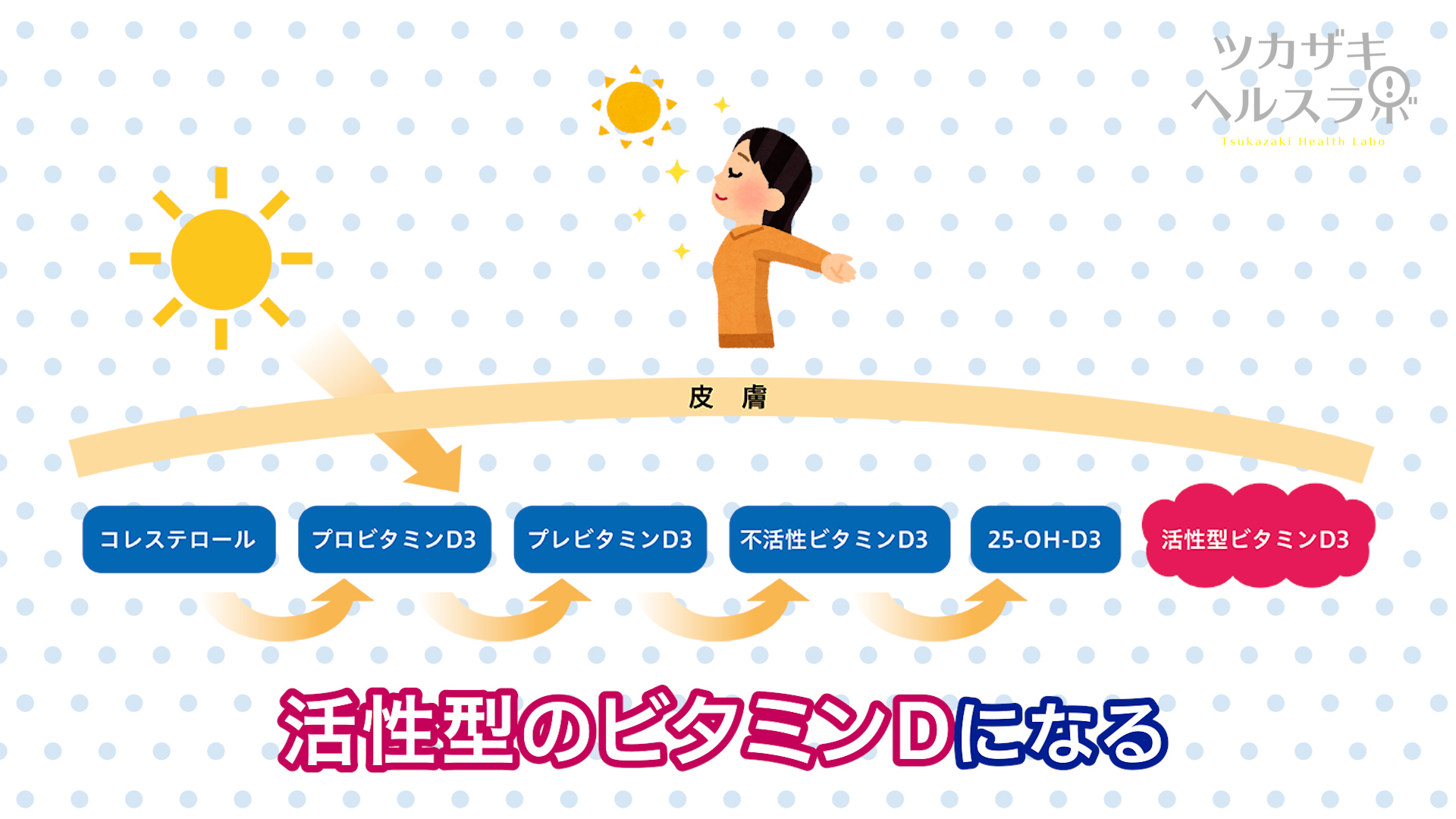 まずはビタミンDです。これは骨のベースであるカルシウムを腸管から吸収するのに役立ちます。ビタミンDはからだの中で作られるビタミンです。日光を浴びるとコレステロールが代謝され、ビタミンDの先駆物になります。それが徐々に代謝されることによって活性型のビタミンDになります。