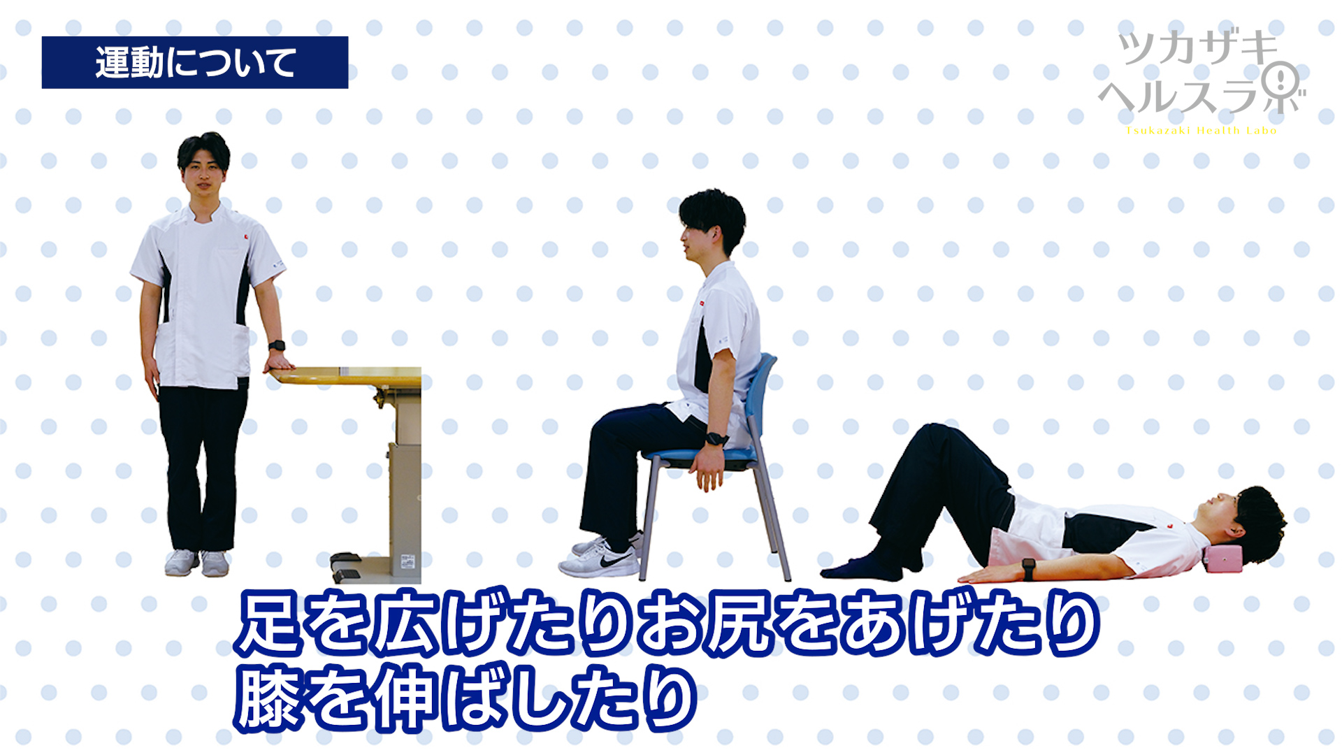 以下のように足を広げたりお尻をあげたり足を伸ばしたりという少しの運動ですが、重力の力が骨を強くすると言われているので、座ったままでもある程度しっかり運動をして頂くことが大事です。
