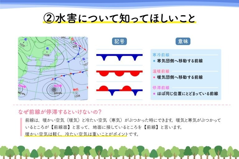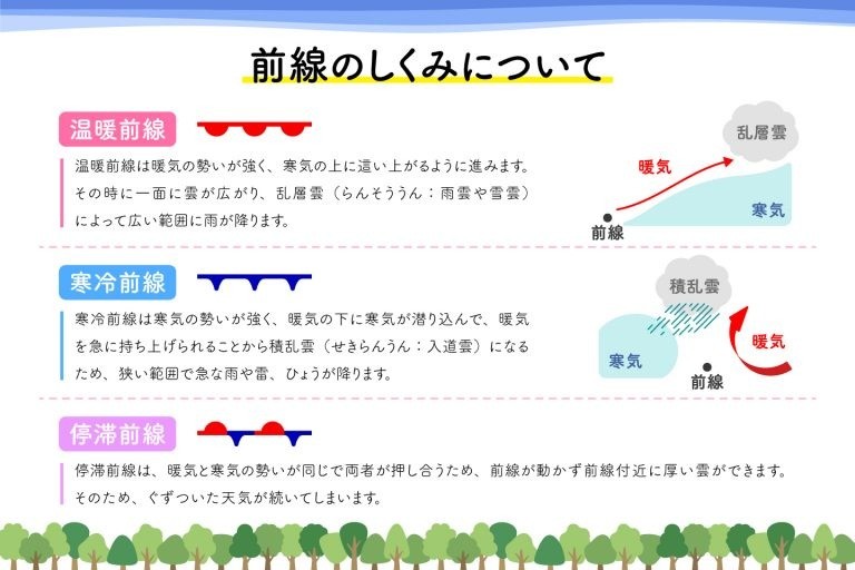 また、気象予報などでよく見かける3種類の前線の見方や意味を知っておくと、より豪雨の備えを行いやすくなります。