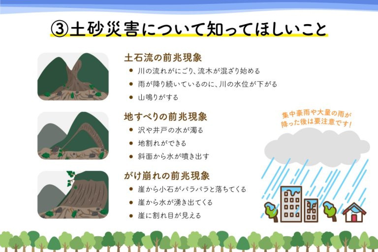 大量の雨が降った後には、土砂災害が起こることを忘れず、警戒情報と素早い行動と、日ごろからの備えが重要です。